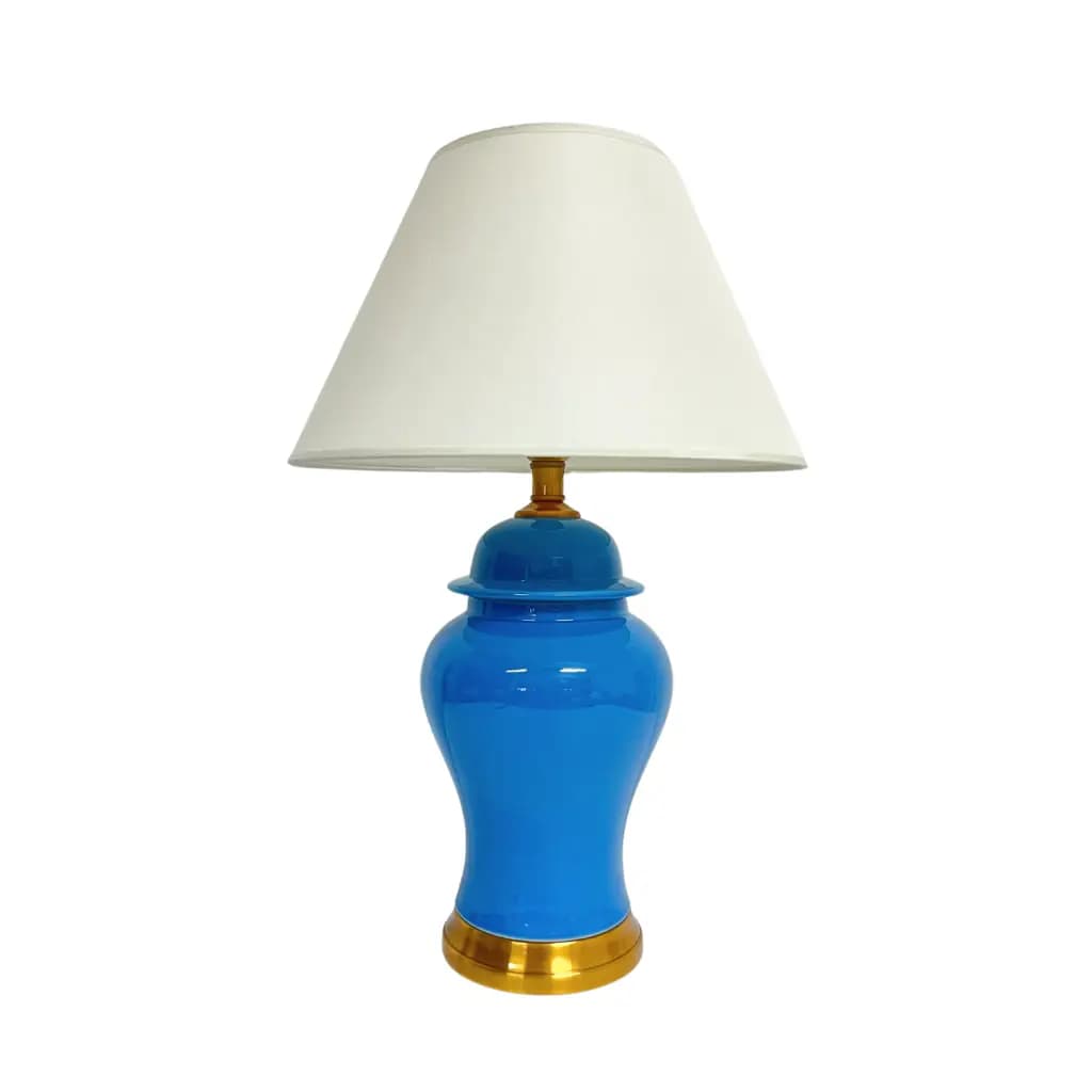 LAMP TEMPLE JAR CRACKLE BLUE H60CM Lampshade included. Colour: BlueDimensions: L39 x W39 x H60cmMaterial: Porcelain, Brass Note: Parts of the product may be hand-painted/hand-crafted; therefore, imperfections might be present which adds to its character. The product might differ slightly in terms of colour and dimensions from the product in the image.